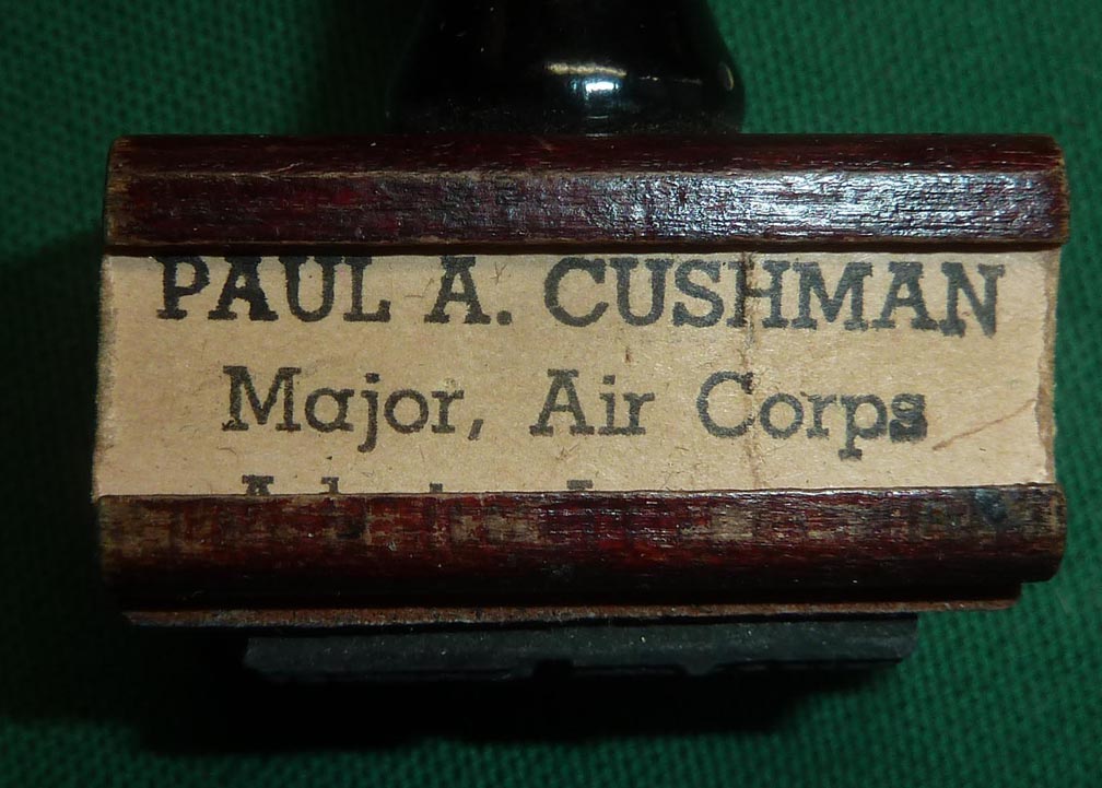 This is a private purchase officer's Sam Browne Belt with Cross Strap, named to Paul Cushman, a career Captain in the Army Air Corps, and ultimately a Major in the US Army Air Forces. He was the Base Administrative Inspector at Randolph Field in Texas, retiring soon after WW2 ended to open a private law practice (I had a photo of him in 2nd Army maneuvers in 1922). Rubber stamp is not included. but I would throw it in on a package deal.